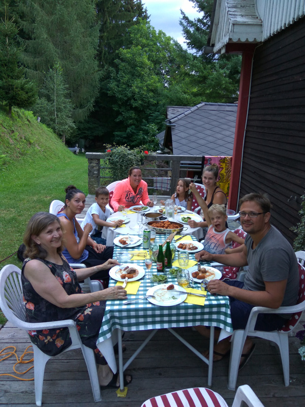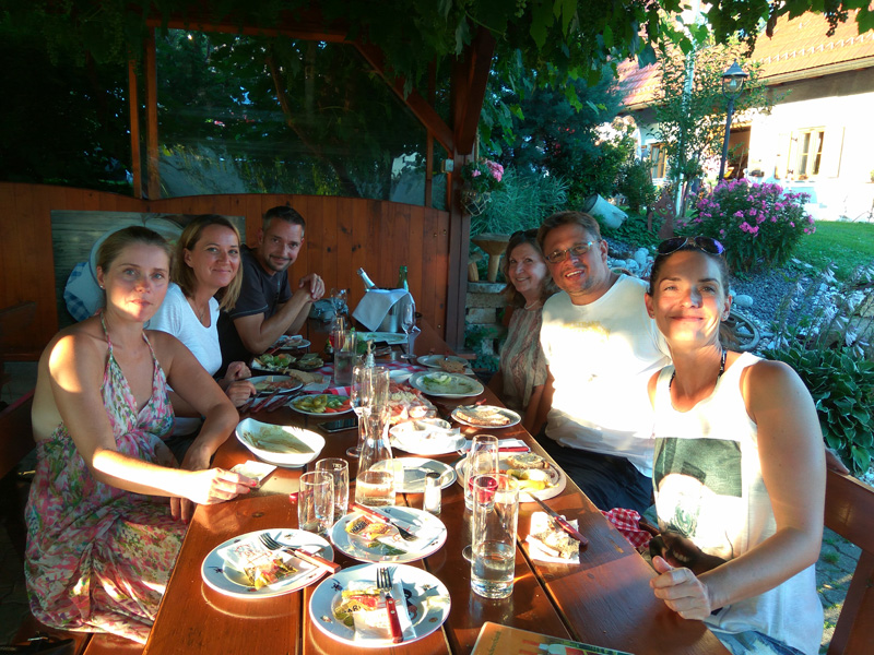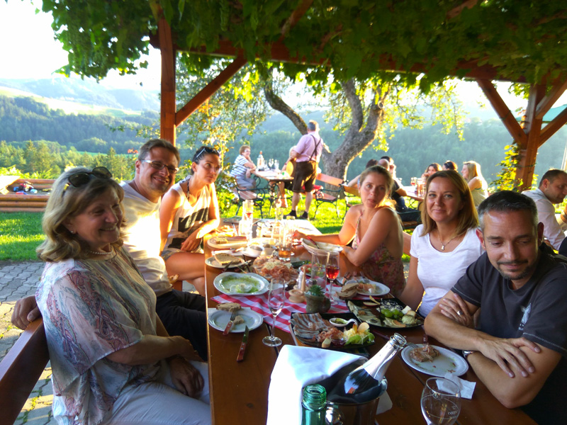 Am Freitag Abend fahren wir bei Maria mit zum Buschenschank, wo wir die ganze restliche Sippe inkl. Sabine treffen. Nach einer guten Brettljausn geht’s wieder zurück am Berg.