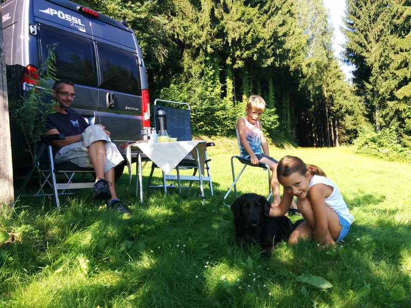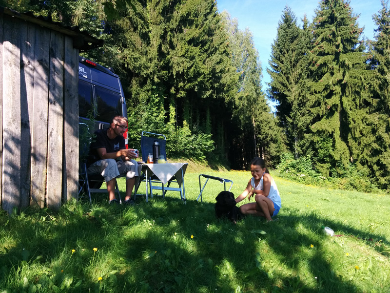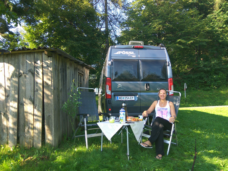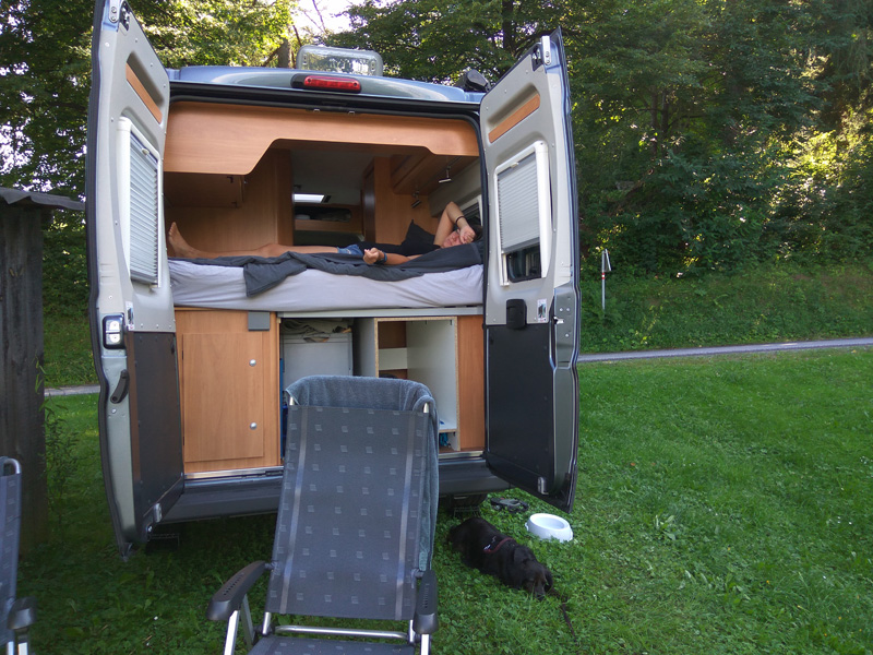 Da ein heisses Wochenende prognostiziert ist, nutzen wir den Wiesen-Parkplatz oberhalb des Pflaum-Hauses als Stellplatz.